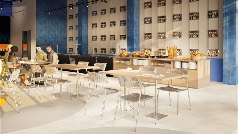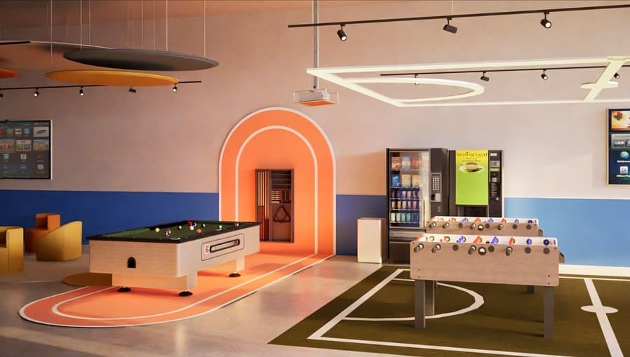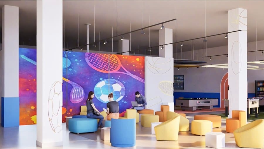 La residencia deportiva se concibe como un entorno pensado para el descanso, la concentración y la convivencia. Desde L’ATELIER Interiorismo desarrollamos el diseño de las zonas comunes, buscando un equilibrio entre la energía del deporte y la calma necesaria para la recuperación.